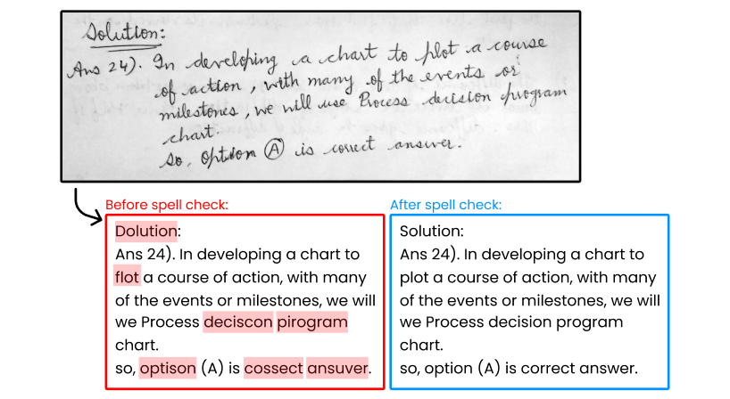 enable_spell_check option to the v3/text and v3/pdfs endpoints. This API option enables a predictive mode for English handwriting that takes word frequencies into account to disambiguate words that are hard to read. This option is skipped when the language is not detected as English. Incorrectly spelled words that are clearly written will not be changed: this predictive mode is only enabled when the underlying handwritten word is visually ambiguous.Demonstrating the new feature on the image below: